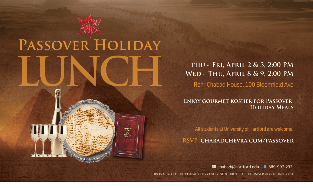 Chabad Chevra will be hosting Seders and providing meals throughout the week for the University of Hartford community.